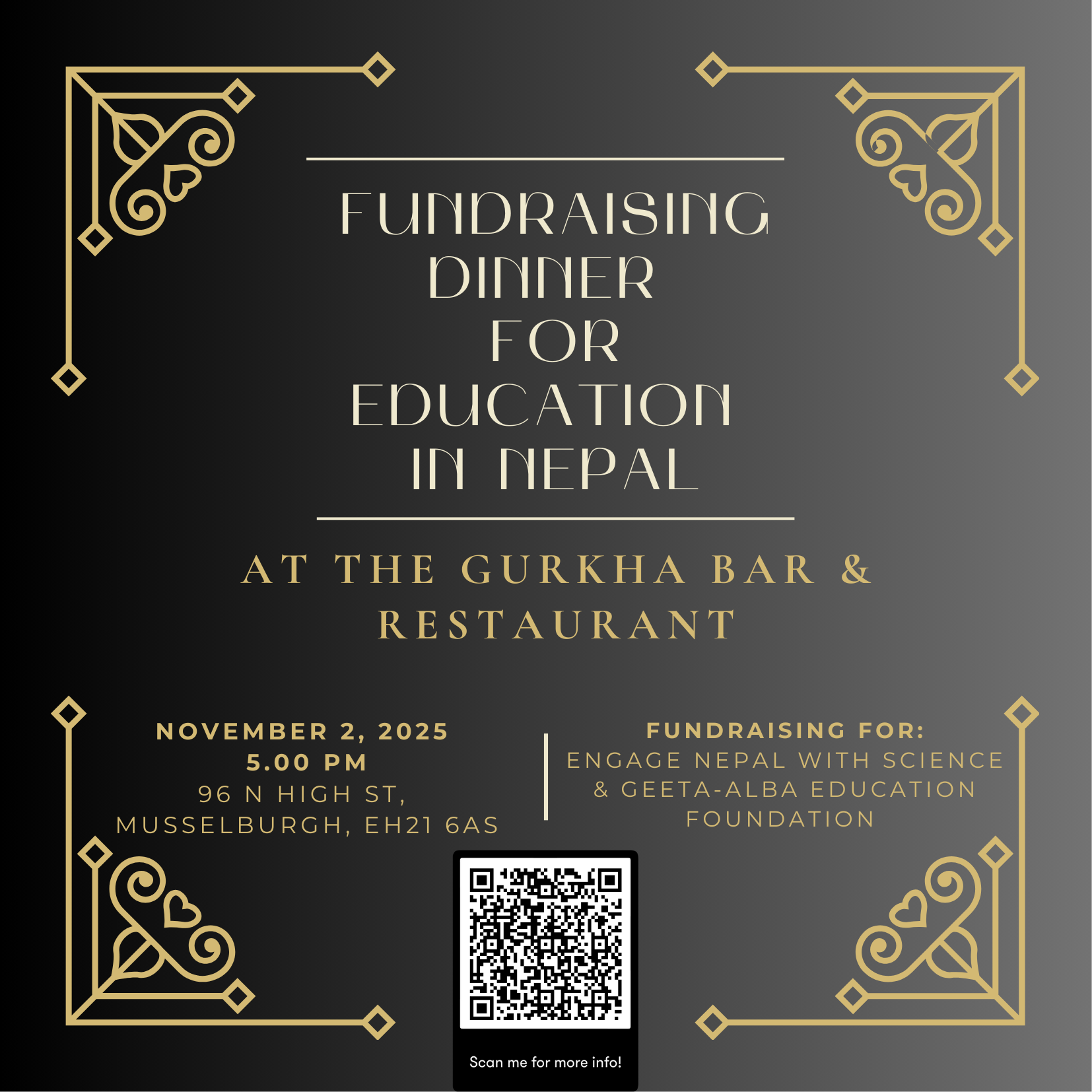 On the 2nd of November 2025 at 5.00 pm at the Gurkha Bar & Restaurant (96 N High Street, Musselburgh, EH21 6AS) we will be organising the second Fundraising dinner for Education in Nepal. We will be fundraising for Engage Nepal with Science and for Geeta-Alba Education Foundation. During the event you will hear everything about the work the two charities carry out in Nepal while you experience a Nepali Buffet Menu (with vegetarian options). Please find the menu below.